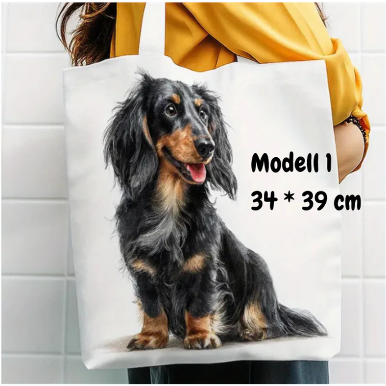 Snygga bärkassar i canvas. Trycket föreställer långhåriga taxar.